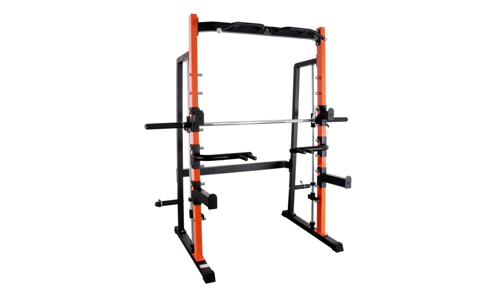 Тренажер Машина Смита на базе силовой рамы. Позволяет выполнять широкий спектр упражнений для проработки различных групп мышц. В комплекте: встроенный гриф, турник, брусья, держатели для хранения дисков 51 мм.