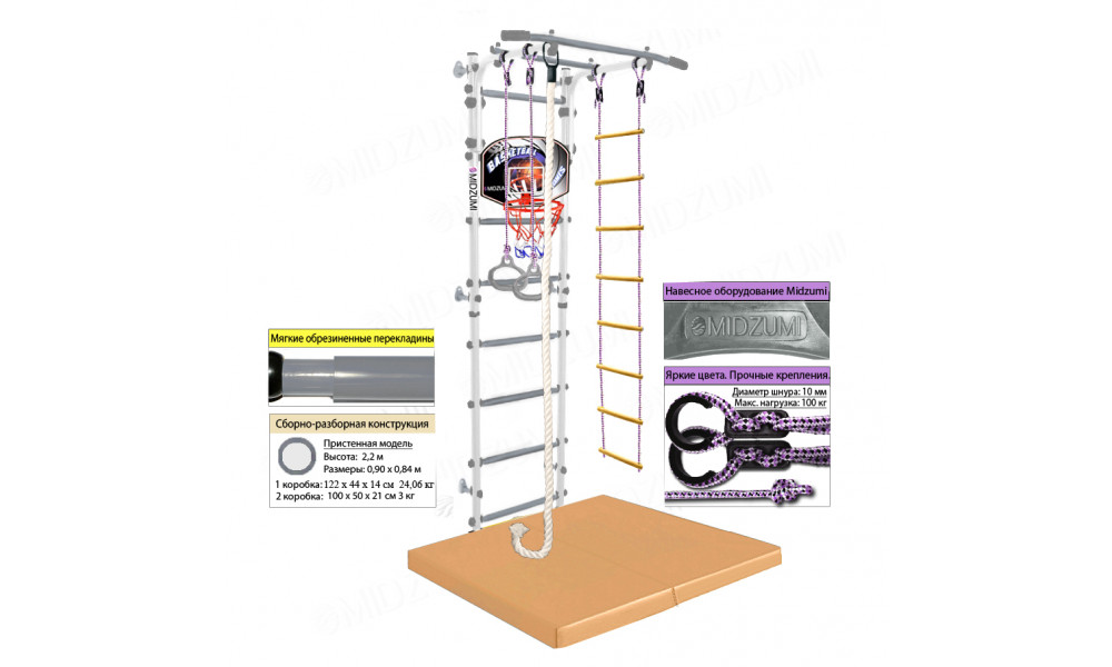 Комплектация: основа - металлическая шведская стенка с турником, гимнастические кольца, канат, веревочная лестница, баскетбольный щит с мячом и насосом, мат гимнастический складной